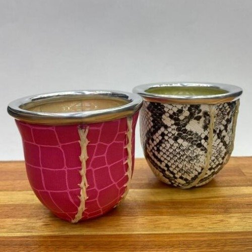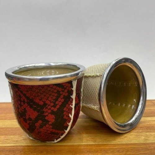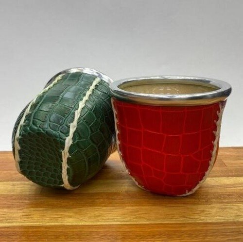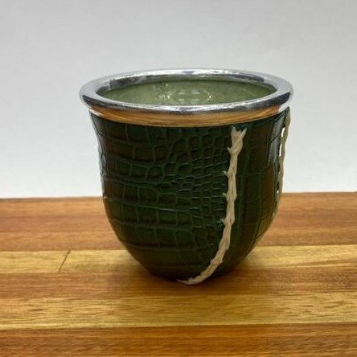 Mate de vidrio forrado con cuerina crocco y costura a mano,